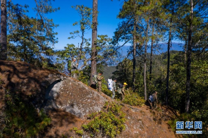 在云南高黎贡山国家级自然保护区,巡护队员在林间穿行(2020年12月25日摄,无人机照片)。新华社记者 江文耀 摄