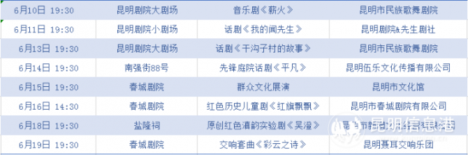 “昆明市庆祝中国共产党成立100周年主题演出周”将在5个场馆(昆明剧院·大剧场、昆明剧院·小剧场、南强街88号、春城剧院、盐隆祠)汇聚8场不同种类的精彩演出:音乐剧《薪火》、话剧《我的闻先生》《干沟子村的故事》《平凡》、群众文化展演、儿童剧《红旗飘飘》、庭院滇韵实验剧《吴澄》、交响套曲《彩云之诗》,为昆明观众带来一场精彩纷呈的夏日艺术盛宴。