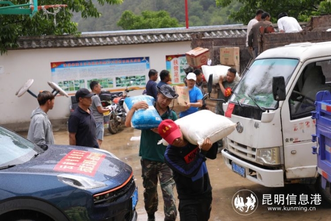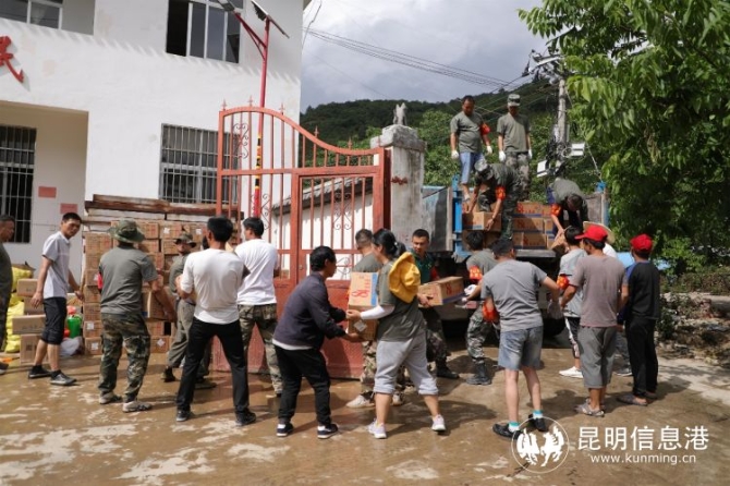 为了及时将物资发放至乡镇,烈日暴晒,加入云南省退役军人抗震支援队的志愿救灾小组,正满头大汗搬运物资。