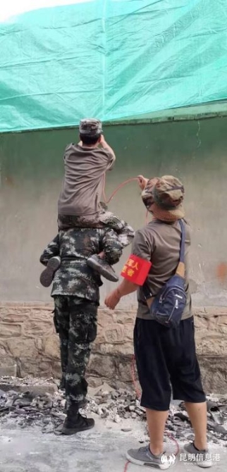 断壁残垣中,云南省道桥施工行业协会志愿者不忘“利他精神”,不畏危险,为村民整修震坏的屋顶。