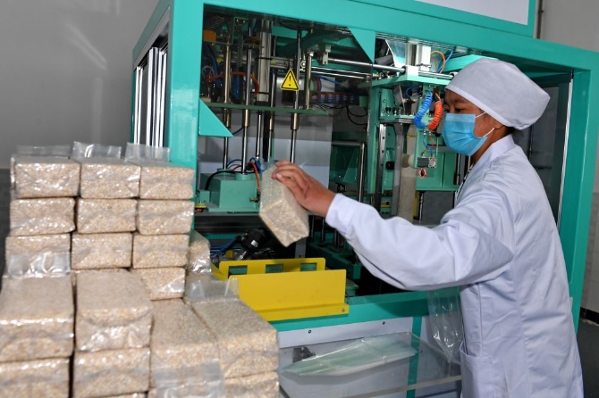 青稞加工厂的工人正在将青稞米装袋(2017年4月27日摄)。新华社记者 张汝锋 摄