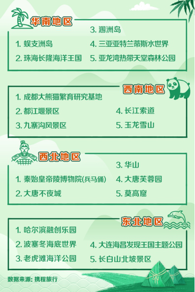 具体来看,华北端午节热门景区前五名是:故宫、颐和园、八达岭长城、五台山、古北水镇;华东前五名周边景区有:上海迪士尼度假区、上海海昌海洋公园、中华恐龙园、第十届中国花卉博览园、南京欢乐谷;华中前五名周边景区有:天门山国家森林公园、橘子洲、武汉海昌极地海洋公园、张家界国家森林公园、芙蓉镇;华南前五名周边景区有:蜈支洲岛、珠海长隆海洋王国、涠洲岛、三亚亚特兰蒂斯水世界、亚龙湾热带天堂森林公园;西南前五名周边景区有:成都大熊猫繁育研究基地、都江堰景区、九寨沟风景区、长江索道、玉龙雪山;西北前五名周边景区有:秦始皇帝陵博物院(兵马俑)、大唐不夜城、华山、大唐芙蓉园、莫高窟;东北前五名周边景区有:哈尔滨融创乐园、波塞冬海底世界、老虎滩海洋公园、大连海昌发现王国主题公园、长白山北坡景区。