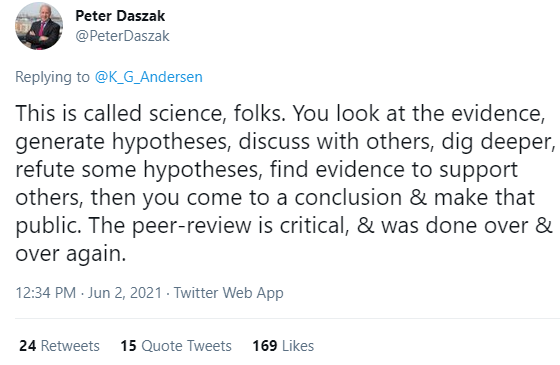 “这才是科学呀,大伙。你观察证据,提出假说,与他人探讨,更深度的挖掘,然后排除其中的一些假说,找到支撑其他假说的证据,然后得出结论并公之于众,接受关键的同行评议,科学一直都是这样进行的”,达萨克说。