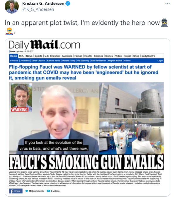 更让安德森自己都哭笑不得的是,诸如英国《每日邮报》这样的西方右翼,不仅完全无视了他讲述的那番科学道理,甚至还拿着他2月1日写给福奇的那份信,攻击起了福奇,说什么福奇早在疫情之初就被安德森警告过病毒是“人造”的,但福奇却选择了无视。
