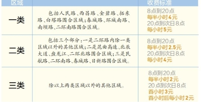 昆明市道路临时停车泊位的收费标准,严格按照2017年昆明市发改委92号文件执行。该文件将停车服务收费划分为三个区域: