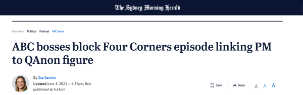 于是,一个原本可以让澳大利亚人乃至中国人都更好地了解莫里森是如何被美国的“匿名者Q”组织影响,如何配合特朗普污蔑中国武汉病毒所,并让澳大利亚媒体铺天盖地地炒作这些阴谋论的调查节目,不仅被在政治的干涉下无法播出,还被其他澳大利亚媒体打上了“不客观”和“抹黑”莫里森的标签。可见澳大利亚的新闻舆论生态有多么恶劣了。
