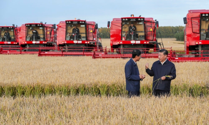 2018年9月25日至28日,习近平在东北三省考察,主持召开深入推进东北振兴座谈会。这是9月25日,习近平在黑龙江农垦建三江管理局七星农场万亩大地号了解粮食生产和收获情况。