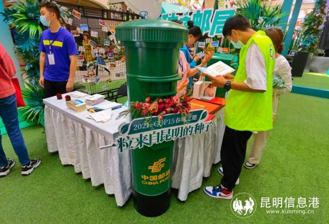 生物多样性文化市集中种子邮局、身边的生物多样性、城市志愿服务三个主题区域备受市民喜爱。在种子邮局首批成功申领明信片盲盒的市民将精美的盲盒盖章完成后来到种子邮局把它寄给其他城市的朋友;在身边的生物多样性区域,参与面塑和共绘生物多样性画卷的小朋友们也有序的在老师的带领下进行创作;在城市志愿服务区主题区域,来自昆明铁道职业技术学院的青年志愿者们积极与广大市民开展COP15的相关讲解。边玩边学的互动过程中,很多市民更深入的了解了活动的意义。