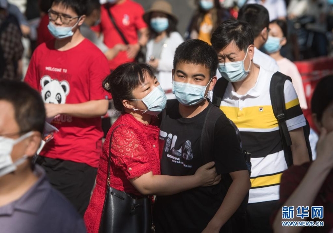 6月7日,老师在内蒙古呼和浩特市第二中学(西校区)考点门口鼓励考生。新华社记者 贝赫 摄