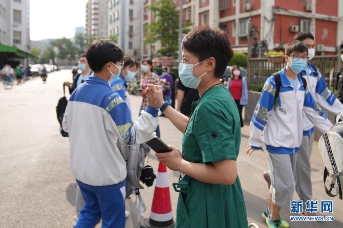 6月7日,在北京市陈经纶中学考点,送考老师与考生击掌。新华社记者 鞠焕宗 摄