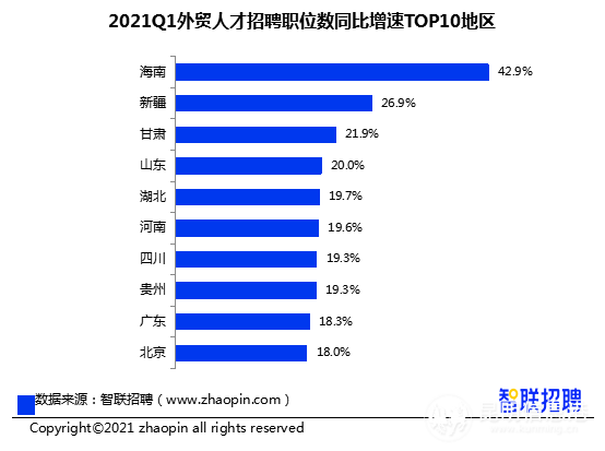 新疆、甘肃对外贸人才的需求,分别以26.9%、21.9%的增速排在第二、第三名,湖北、河南、四川、贵州也跻身增速前十省份。