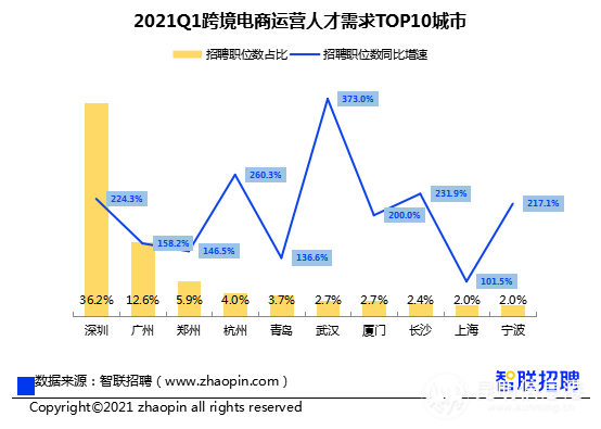 在中欧班列开行数量不断增加、我国与东盟和“一带一路”沿线国家经贸合作持续深化背景下,中西部地区外贸日益活跃,承接产业转移能力增强。一季度,中西部地区外贸进出口总额同比增长45.1%,增速比外贸整体增速高15.9个百分点。其中湖北迅速恢复,一季度全省进出口总额达1174.6亿元,同比增长88.1%,武汉跨境电商运营人才招聘需求也呈现井喷式增长,同比增速达373%。