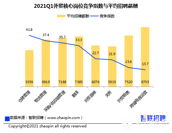 智联招聘近日发布《2021外贸人才形势研究报告》,其中揭示,一季度外贸人才需求同比增长11.2%,但外贸行业简历投递量同比下降35.6%,呈现人才供给不足迹象;跨境电商运营人才需求因疫情同比猛增2倍。