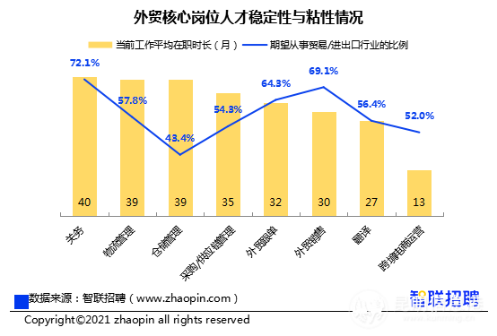 外贸进出口行业的人才吸引力不高,但从业人员的稳定性较强。当前从业者的平均在职时长为34个月,与全行业平均水平相比高出4个月。观察外贸从业者求职时期望下一步从事的行业,46.7%的依然选择本行业,这一比例也略高于全行业平均水平45.9%,由此可见外贸从业者的稳定性及粘性较好。(昆明信息港 记者江枫)