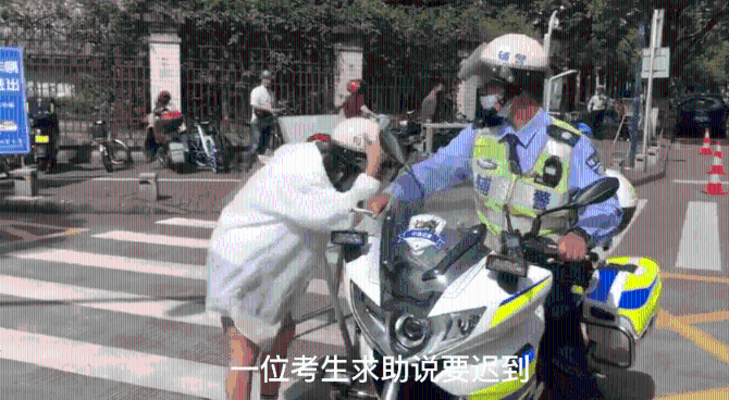 一辆警用摩托车载着一位考生