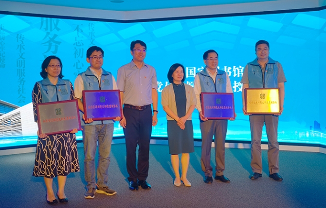6月8日上午,国家图书馆新阅读空间开放暨党员志愿服务总队成立活动在国家图书馆总馆北区举行。活动现场,国家图书馆党委书记、副馆长魏大威,国家图书馆副馆长、党委副书记陈樱为4支党员志愿服务分队代表授牌。