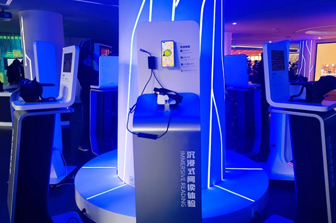 “全景展厅”首次采用270度环绕的LED三折屏幕,实现巨幕裸眼VR效果,读者置身于三面超高清大屏环绕的全景空间,可获得较强的沉浸感和真实的画面感。“阅读树”将移动智能设备、VR设备与树形展架有机结合,读者可通过现场不同的VR设备终端,观看古代典籍、国画、文物古迹、城市印象等不同类型的VR视频资源。