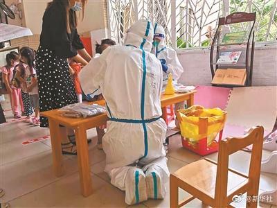 在广东多地启动的大规模核酸检测中,身着防护服的医务人员们不畏高温炎热,被人们亲切地称为“大白”。6月9日,东莞市虎门镇口腔科医生陈达峰在东方社区为行动不便的老人进行流动检测,为了让老人家舒服一点,他多次跪下来采集。6月7日,深圳市产科护士杨海萍为一名母亲怀抱中的孩子做核酸,她的姿势也是跪了下来。5月27日,广州市番禺区石楼镇社区卫生服务中心黎国伟在幼儿园采集咽拭子时,同样选择了跪下来以减少孩子们的呕吐反应。跪下来,降低了高度,增加了温度。“大白”们,谢谢你们,让老人孩子们被温柔以待。(记者 田建川)
