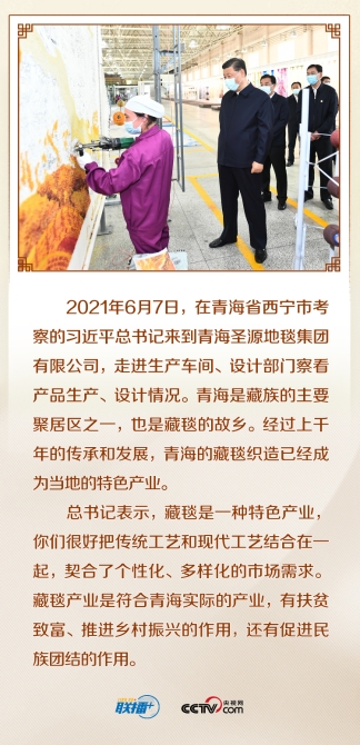 6月7日下午,在青海省西宁市考察的习近平总书记来到青海圣源地毯集团有限公司,走进生产车间、设计部门察看产品生产、设计情况。青海是藏族同胞的主要聚居区之一,也是藏毯的故乡。经过上千年的传承和发展,青海的藏毯织造已经成为当地的特色产业。在这里,总书记为藏毯织造这一传统工艺点赞,并希望青海发展更多这样的特色产业,靠创新实现更好发展。
