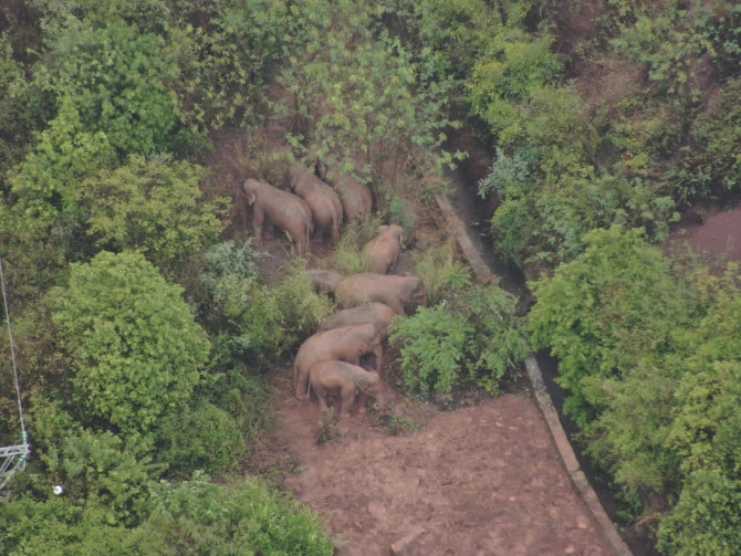 云南省森林消防总队监测显示,象群6月11日凌晨1时22分象群进入易门县十街乡西南方向山林,上午9时,群象睡觉休息,云南省森林消防总队搜寻监测任务分队5人持续跟踪监测。截止16时,独象位于昆明市安宁市八街街道,距离象群约16公里。(光明日报全媒体记者张勇,图片视频来源:云南森林消防总队)