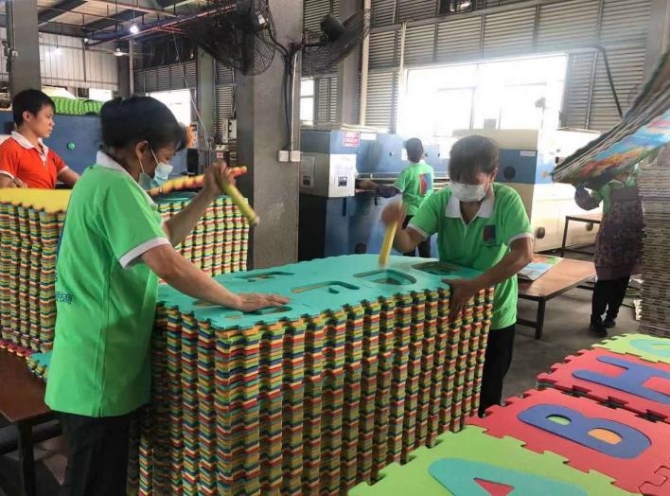 以前只能在村里带小孩的苏榕妹,搬迁后来到工厂里已经工作3年多了,“每天工作8小时,骑车10多分钟就能到家,来这里工作后学习了很多,每月能有3000多的收入,还有五险保障,挺满足的。”