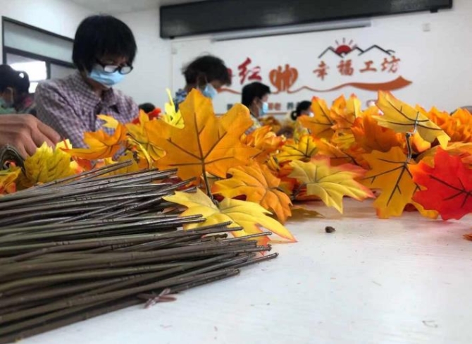 针对60至80岁仍有就业意愿的老年居民,安置区还开设了夕阳红幸福工坊,工坊内提供手工插花技能培训、生产加工等,每天有近40人在场内进行生产,也可以选择在家加工制作。“每天接送孙子孙女上下学,空闲时间就来这里,一天能做100多支手工花,有活干挺好的。”63岁的韦凤香搬来这里两年多,工作的同时还认识了很多新邻居。