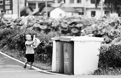 在浙江省安吉县港口村,一名儿童准备将垃圾扔进分类垃圾桶。新华社发