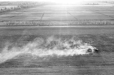 在新疆阿克苏地区沙雅县,农用机械在采收完的棉田里进行残膜回收、秸秆粉碎还田作业。新华社发