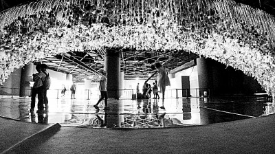观众在上海科技馆参观由回收塑料制品组成的装置艺术作品“巨环”。新华社发