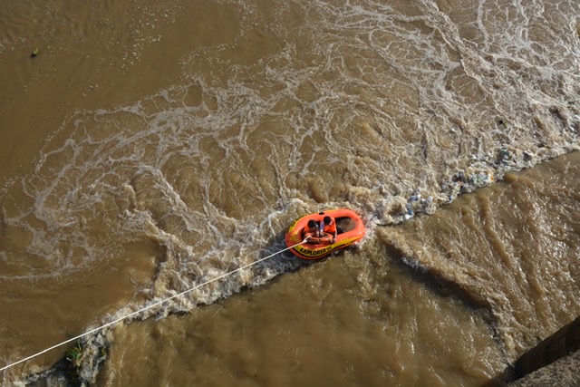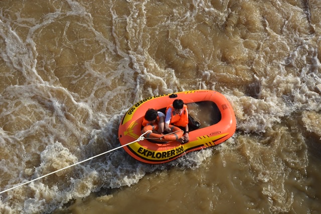昆明信息港讯 记者劳学丽 通讯员杨宏辉 6月12日,两少年在昆明市宜良县南盘江上静止水域用皮划艇游玩时,由于上游突降暴雨,导致江水上涨,水流湍急,加上操作不当,漂流至陈所渡大桥,被困桥下“暗流”。被困位置暗流汹涌,皮划艇内已进水,情况十分危急。17时47分,接到报警后,宜良县消防救援大队立即出动1车7人赶赴现场救援。