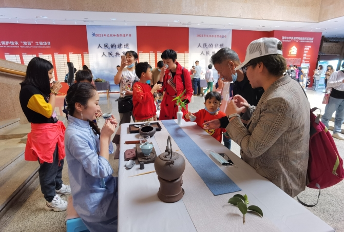 6月12日,为庆祝2021年国家文化和自然遗产日,云南民族博物馆特别推出了“人民的非遗 人民共享”主题活动。近10位非遗代表传承人亲临博物馆,现场演示非遗技艺,同时邀请观众体验中医推拿、茶艺表演、线装书制作、拓片印刷、五彩线编织、香包制作、粽子制作以及品尝云南咖啡和鲜花饼。