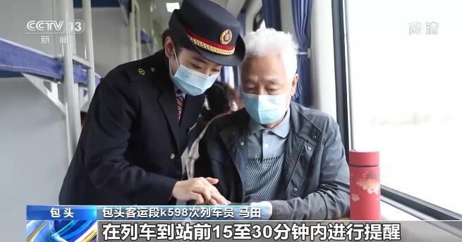 包头客运段k598次列车员 马田:我们提前通过移动手持终端了解全列旅客信息,对重点旅客进行标记,主动服务。在列车到站前15至30分钟内进行提醒,并帮助老年旅客提前准备行程码,方便出站。