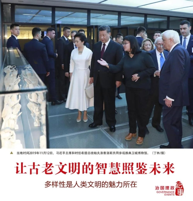 地中海冬日的和煦阳光里,习近平主席和夫人彭丽媛在时任希腊总统帕夫洛普洛斯夫妇陪同下参观雅典卫城博物馆。从古希腊大理石雕像上的“拔火罐”图案谈到古代中医,从酒神剧场复原模型讲到艺术和教育……习近平主席仔细听取讲解,不时询问历史细节。在这场跨越时空的文明对话中,人们感受着两大文明古国“酒逢知己千杯少”的真挚友谊,领略到文明交流触发的心灵共鸣。