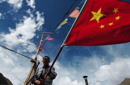 △青藏铁路沿线的藏族群众纷纷挂起国旗,喜迎青藏铁路全线通车。