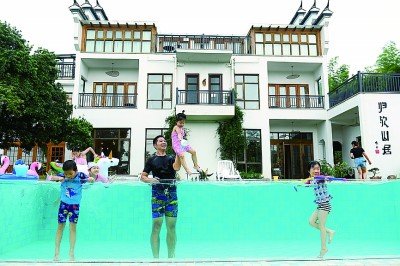 游客在浙江湖州埭溪镇芳山村的“归欤山居”民宿泳池内嬉水。新华社发