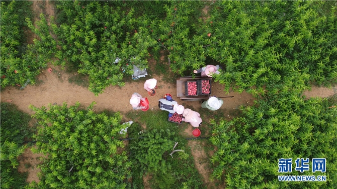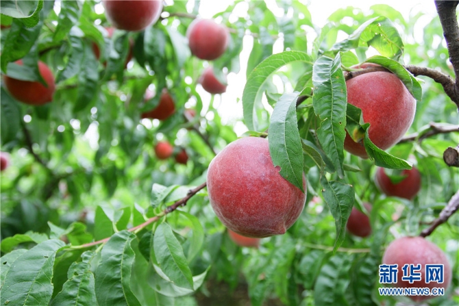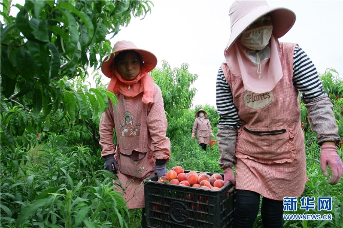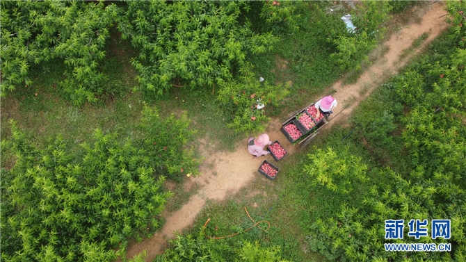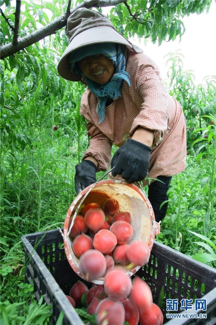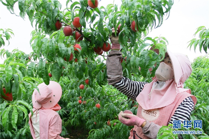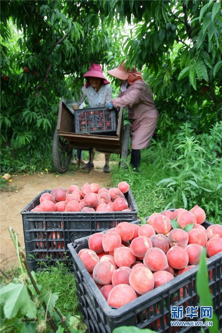 2021年6月5日,盘江镇河西村高原特色种植示范园内,农民正在采摘桃子。新华网发(杨俊鹏摄影报道)