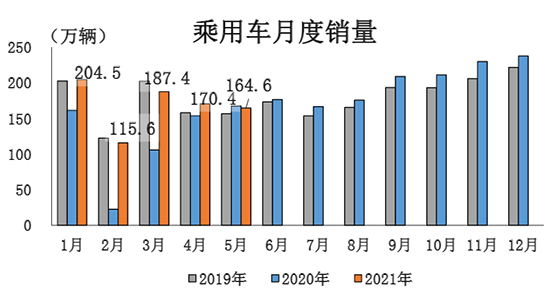 1-5月,乘用车产销分别完成828.5万辆和843.7万辆,同比分别增长39.1%和38.1%,增幅比1-4月继续回落16.2和15个百分点。与2019年同期相比,产量同比下降1.4%,销量同比增长0.3%,其中产量降幅比1-4月继续收窄2个百分点,销量增速已实现由负转正。