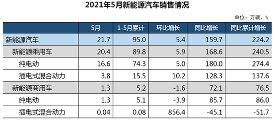 按照新能源车驱动方式来看,1-5月纯电动汽车产销分别完成81.8万辆和79.4万辆,同比分别增长2.6倍和2.5倍;插电式混合动力汽车产销分别完成14.9万辆和15.6万辆,同比分别增长1.1倍和1.3倍。