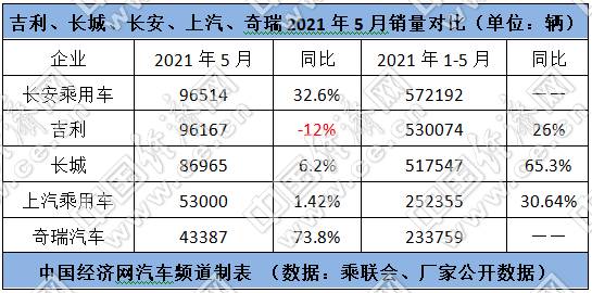 去年同期低基数带来的增量,在5月已基本消除。数据显示,5月,国内狭义乘用车共销售162.3万辆,同比增长1%,销量走势基本回归正常。有着“自主三强”之称的吉利、长城、长安,增速正出现严重分化:多年的 “自主一哥”——吉利汽车,已经连续2个月出现销量同比下滑,跌幅还呈现明显扩大态势;前两年遭遇转型阵痛的长安和长城,目前正处于红利的收获期,两家企业的销量增幅均跑赢车市大盘。
