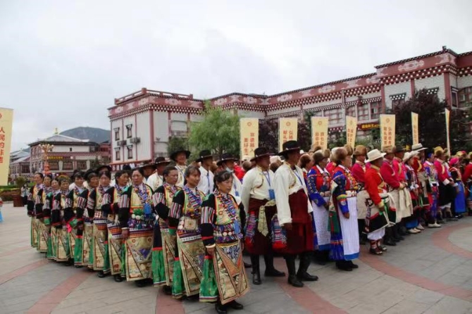 6月12日在坛城广场,来自香格里拉建塘镇、小中甸、格咱等地的9支队伍144人身着节日盛装,相聚在一起,开启国家级非物质文化遗产“迪庆锅庄舞展演赛”。