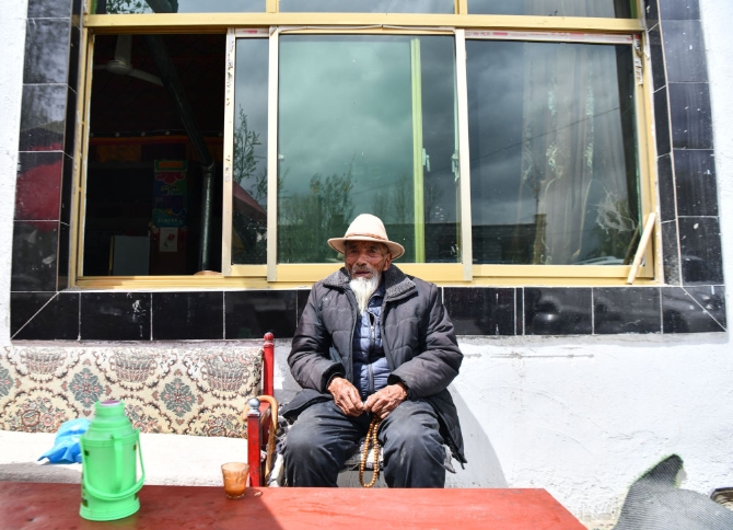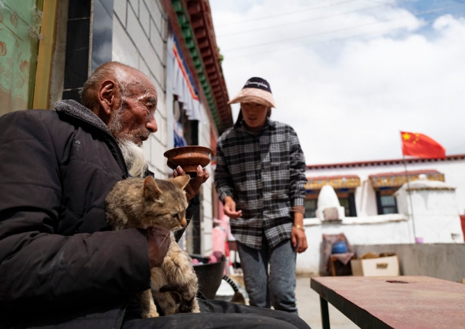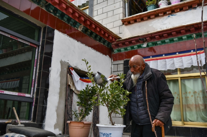 次多杰老人准备去茶馆找老朋友喝茶聊天(4月25日摄)。