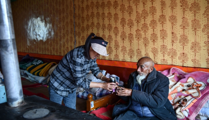 次多杰老人的孙女在给老人敬茶(4月25日摄)。
