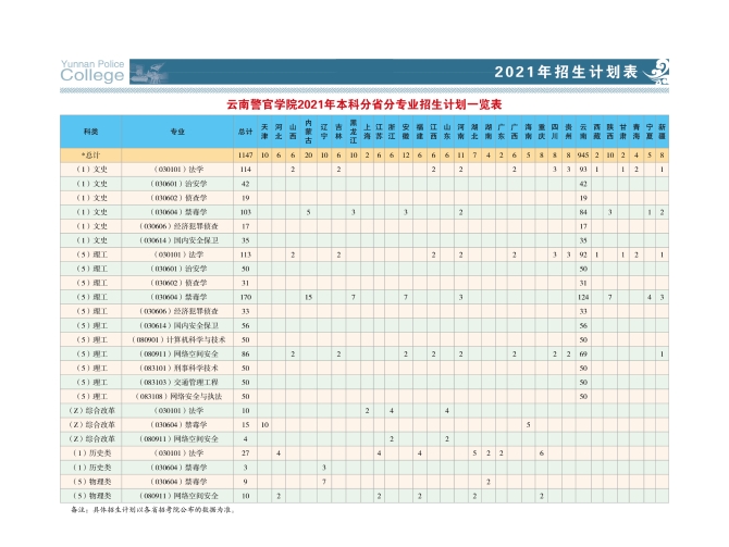 昆明信息港讯 记者合宇聪 6月16日,云南警官学院发布2021年本科招生计划,面向全国共招录1147人。其中:提前批次公安专业招生总数733人(就业面向地方公安机关省内各州市招生633人、就业面向云南边防检查总站省内招生8人、禁毒学公安专业省外招生92人);本科二批次非公安专业面向全国招生414人。