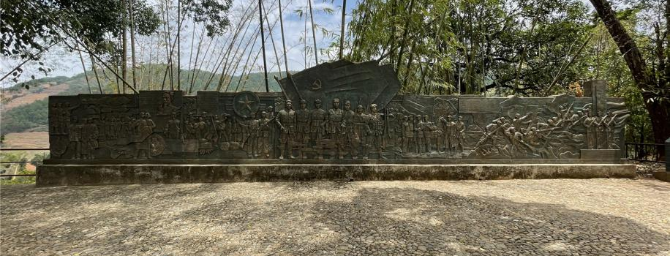 上午,云视网直播团队走进临沧市双江县大文乡。第一站,记者来到了圈控起义的宣誓地点,这里有一棵高大的百年榕树,当年起义人员就在大榕树下进行了庄严的宣誓,进而打响了解放双江、缅宁革命起义的第一枪。榕树后方,一面长17米的浮雕墙格外引人注目,它以李闻惨案、圈控起义等重要历史事件为题材,全面反映了圈控起义的历史背景和事件经过。在离榕树不远的山顶上,还矗立着一座高大的圈控起义纪念碑。整座碑为正四面体,从底座到碑顶逐层缩小,呈放射状结构。纪念碑上,第一层雕刻的是碑记和简介,记录了圈控起义历史事件的经过和宣誓起义及主要战役场景浮雕。第二层则雕刻了小红旗和镰刀斧头图案,分别象征起义时高举革命大旗和革命起义由中国共产党领导。碑顶为圆球四面雕刻五角星,象征边疆各民族团结一心拥护党。