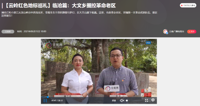6月15日,《镜头里的故事·云岭红色地标巡礼》大型主题系列直播暨党史学习教育直播之临沧篇走进双江县大文乡革命老区,通过直播圈控起义宣誓地点、浮雕墙、纪念碑和浦家大院等一批红色地标,让网友重温红色记忆,弘扬红色文化,传承红色基因,进一步汲取奋斗新征程的红色力量。
