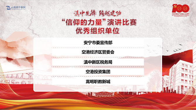 经过激烈地角逐,7名选手最终脱颖而出,他们将组成“滇中新区巡回演讲团”并开启巡回演讲,把党史学习教育的新区“好声音”传递到新区机关、昆明空港经济区、安宁市、嵩明杨林经济技术开发区等地,引导新区广大党员干部用担当诠释初心、用奋斗承载使命,在新时代树立新区标准、凝聚新区精神、展现新区作为。