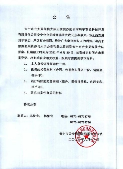 近日,安宁市公安局发布公告,两家公司涉嫌非法吸收公众存款,为全面查清犯罪事实,严厉打击犯罪,维护广大集资参与人的利益,请尚未报案的集资参与人到安宁市公安局经侦大队报案。