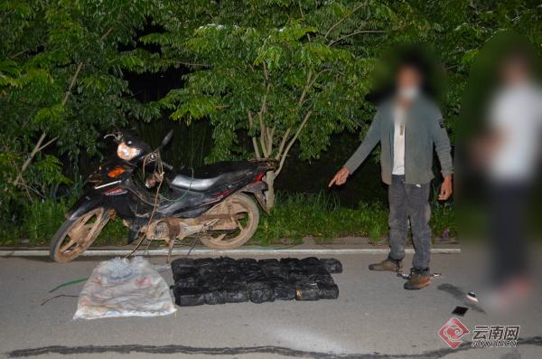 6月12日23时50分许,该站民警在勐海县某乡镇开展巡逻查缉时,一灰衣男子驾驶一辆摩托车突然快速超车,执勤民警发现该摩托车尾架上绑着一个白色编织袋,行迹十分可疑,当即进行尾随追赶,并于次日00时01分许将该摩托车拦下,驾车男子见状立即弃车逃窜,民警利用周围地势与堵截车辆形成包围圈,成功将该男子抓获。