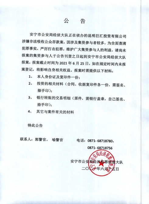 昆明信息港讯 记者合宇聪 6月15日、16日,昆明市安宁市公安局连续发布公告:昆明巨汇投资有限公司及云南琦宇节能科技开发有限责任公司安宁分公司涉嫌非法吸收公众存款,为全面查清犯罪事实,严厉打击犯罪,维护广大集资参与人的利益,请尚未报案的集资参与人到安宁市公安局经侦大队报案。