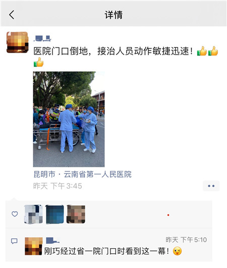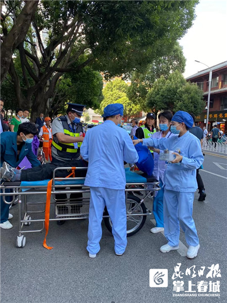 6月16日下午3点45分左右,不少路过东寺街的市民都看到了这样一幕:一名市民突然倒在街边,被附近云南省第一人民医院(以下简称“省一院”)值守的保安看见后,通知了省一院急诊内科,急诊内科护士长关万高与值班医护人员第一时间赶到现场评估病情后,快速将倒地的市民转运到急诊内科心肺复苏室进行抢救。